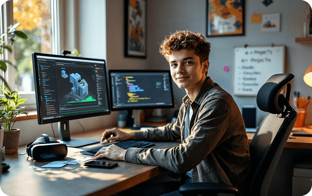 Курс готує підлітків до першого кроку в ігровій індустрії. Учні створюють власні 2D, 3D, AR та VR-ігри, вивчають Unity і програмування на C#. В програму інтегровані AI-інструменти для генерації локацій, персонажів і коду. Навчання повністю практичне — з готовими ігровими проєктами на виході.